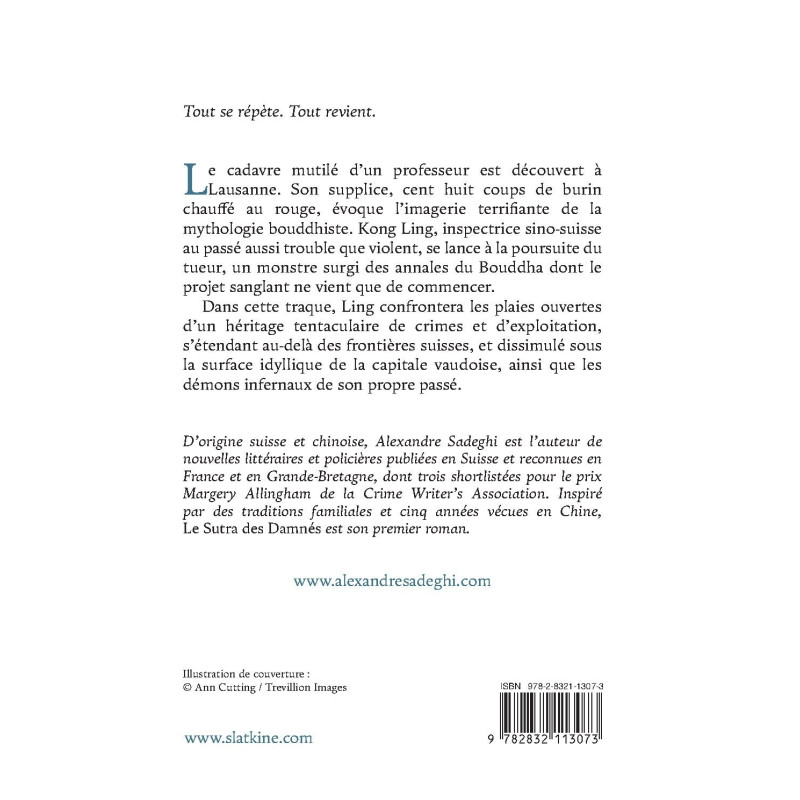 D’origine suisse et chinoise, Alexandre Sadeghi est l’auteur de nouvelles littéraires et policières publiées en Suisse et reconnues en France et en Grande-Bretagne, dont trois shortlistées pour le prix Margery Allingham de la Crime Writer’s Association. Inspiré par des traditions familiales et cinq années vécues en Chine, Le Sutra des Damnés est son premier roman.