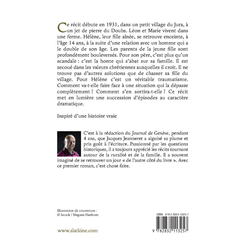Ce récit débute en 1931, dans un petit village du Jura, à un jet de pierre du Doubs. Léon et Marie vivent dans une ferme. Hélène, leur fille aînée, se retrouve enceinte, à l’âge de 14 ans, à la suite d’une relation avec un homme qui a le double de son âge. Les parents de la jeune fille sont profondément bouleversés. Pour son père, c’est plus qu’un scandale : c’est la honte qui s’abat sur sa famille. Il est secoué dans les valeurs chrétiennes auxquelles il croit. Il ne trouve pas d’autres solutions que de chasser sa fille du village. Pour Hélène c’est un véritable traumatisme. Comment va-t-elle faire face à une situation qui la dépasse complètement ? Comment s’en sortira-t-elle ? Ce récit met en lumière une succession d’épisodes au caractère dramatique.
