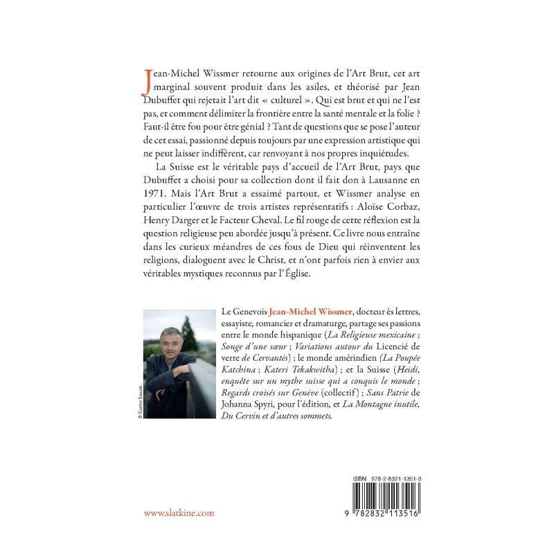 La Suisse est le véritable pays d’accueil de l’Art Brut, pays que Dubuffet a choisi pour sa collection dont il fait don à Lausanne en 1971. Mais l’Art Brut a essaimé partout, et Wissmer analyse en particulier l’oeuvre de trois artistes représentatifs : Aloïse Corbaz, Henry Darger et le Facteur Cheval. Le fil rouge de cette réflexion est la question religieuse peu abordée jusqu’à présent. Ce livre nous entraîne dans les curieux méandres de ces fous de Dieu qui réinventent les religions, dialoguent avec le Christ, et n’ont parfois rien à envier aux véritables mystiques reconnus par l’Église.
