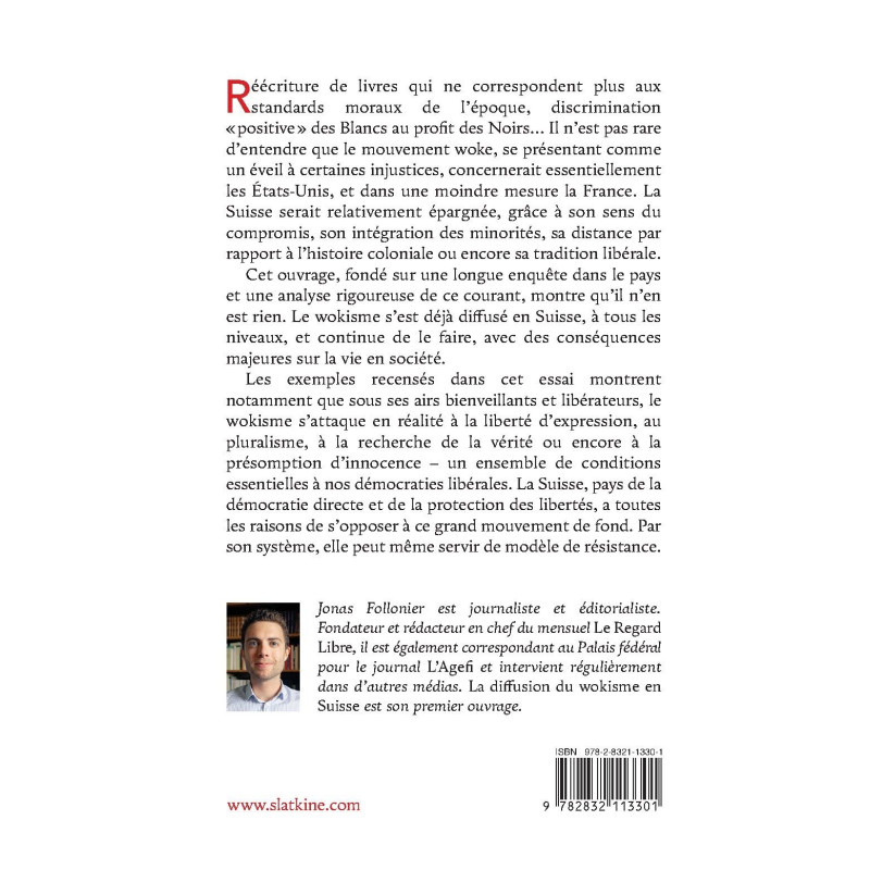 Jonas Follonier est journaliste et éditorialiste. Fondateur et rédacteur en chef du mensuel Le Regard Libre, il est également correspondant au Palais fédéral pour le journal L’Agefi et intervient régulièrement dans d’autres médias. La diffusion du wokisme en Suisse est son premier ouvrage.