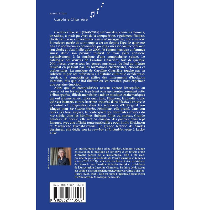 Alors que les compositrices restent encore l’exception au concert et sur les ondes, le présent ouvrage montre comment cette Fribourgeoise, fille de menuisier, a mis en musique les thématiques qui ont jalonné sa vie, telles que l’âme, l’humour, la révolte. Celle qui s’est insurgée contre le crime organisé dans Rivolta a trouvé le réconfort et l’inspiration dans les séquences d’Hildegard von Bingen pour De Sancta Maria. Féministe, elle prend, dans son opéra Les trois soupirs, le contre-pied des librettistes d’opéra du XIXe siècle, dont les héroïnes finissent folles ou mortes. Grande amatrice de poésie, elle met en musique des poèmes dans sept langues, avec une affinité toute particulière pour Emily Dickinson et Marguerite Burnat-Provins. Et grande lectrice de bandes dessinées, elle dédie son Le cow-boy et la double-crème à Lucky Luke.