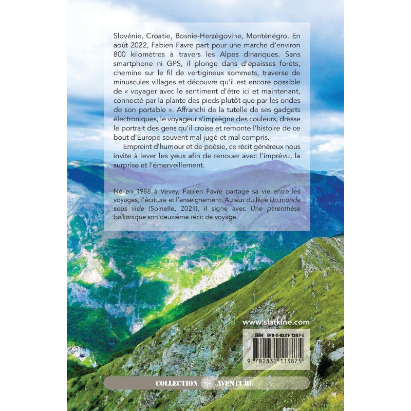 Slovénie, Croatie, Bosnie-Herzégovine, Monténégro. En août 2022, Fabien Favre part pour une marche d’environ 800 kilomètres à travers les Alpes dinariques. Sans smartphone ni GPS, il plonge dans d’épaisses forêts, chemine sur le fil de vertigineux sommets, traverse de minuscules villages et découvre qu’il est encore possible de « voyager avec le sentiment d’être ici et maintenant, connecté par la plante des pieds plutôt que par les ondes de son portable ». Affranchi de la tutelle de ses gadgets électroniques, le voyageur s’imprègne des couleurs, dresse le portrait des gens qu’il croise et remonte l’histoire de ce bout d’Europe souvent mal jugé et mal compris.