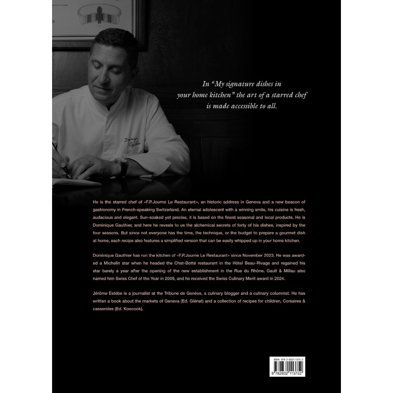 He is the starred chef of «F.P. Journe Le Restaurant», an historic address in Geneva and a new beacon of gastronomy in French-speaking Switzerland. An eternal adolescent with a winning smile, his cuisine is fresh, audacious and elegant. Sun-soaked yet precise, it is based on the finest seasonal and local products. He is Dominique Gauthier, and here he reveals to us the alchemical secrets of forty of his dishes, inspired by the four seasons. But since not everyone has the time, the technique, or the budget to prepare a gourmet dish at home, each recipe also features a simplified version that can be easily whipped up in your home kitchen.