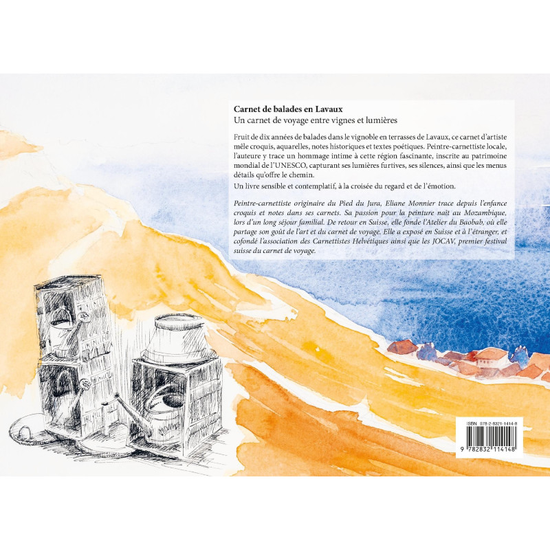 Fruit de dix années de balades dans le vignoble en terrasses de Lavaux, ce carnet d’artiste mêle croquis, aquarelles, notes historiques et textes poétiques. Peintre-carnettiste locale, l’auteure y trace un hommage intime à cette région fascinante, inscrite au patrimoine mondial de l’UNESCO, capturant ses lumières furtives, ses silences, ainsi que les menus détails qu’off re le chemin.