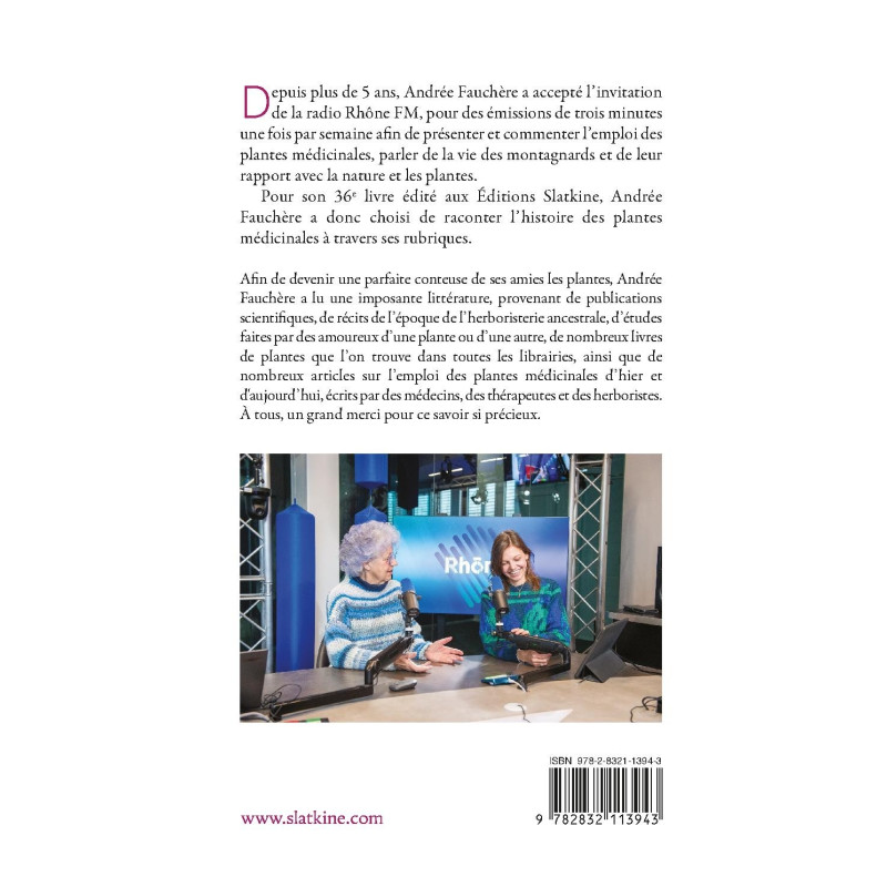Depuis plus de 5 ans, Andrée Fauchère a accepté l’invitation de la radio Rhône FM, pour des émissions de trois minutes une fois par semaine afin de présenter et commenter l’emploi des plantes médicinales, parler de la vie des montagnards et de leur rapport avec la nature et les plantes.