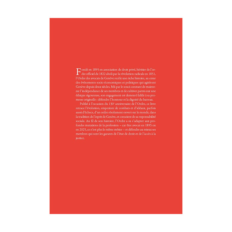 Publié à l’occasion du 130e anniversaire de l’Ordre, ce livre retrace l’évolution, empreinte de combats et d’idéaux, parfois aussi d’échecs, d’un barreau résolument ouvert sur le monde, dans la tradition de l’esprit de Genève, et conscient de sa responsabilité sociale. Au fil de son histoire, l’Ordre a su s’adapter aux profondes mutations de la profession, car être avocat en 1895 ou en 2025 ce n’est plus le même métier. Mais aujourd’hui comme hier, il continue de soutenir ses membres afin que ceux-ci, garants de l’état de droit, assurent aux justiciables un accès effectif à la justice et au droit.