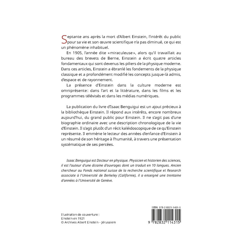 La publication du livre d’Isaac Benguigui est un ajout précieux à la bibliothèque Einstein. Il répond aux intérêts, encore nombreux aujourd’hui, du grand public pour Einstein. Il ne s’agit pas d’une biographie ordinaire avec une description chronologique de la vie d’Einstein. Il s’agit plutôt d’un récit kaléidoscopique de ce qu’Einstein représente. Il emmène le lecteur des années d’enfance d’Einstein à un résumé de son héritage à l’humanité, à travers une présentation systématique de ses percées.