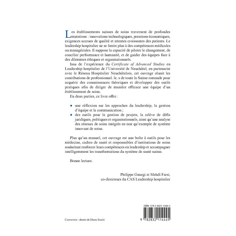 Plus qu’un manuel, cet ouvrage est une boite à outils pour les médecins, cadres de sante et responsables d’institutions de soins souhaitant renforcer leurs compétences en leadership et accompagner intelligemment les transformations du système de sante suisse.