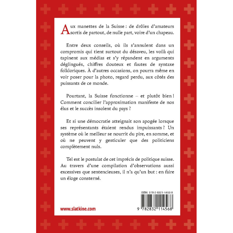 Tel est le postulat de cet imprécis de politique suisse. Au travers d’une compilation d’observations aussi excessives que sentencieuses, il n’a qu’un but : en faire un éloge consterné.