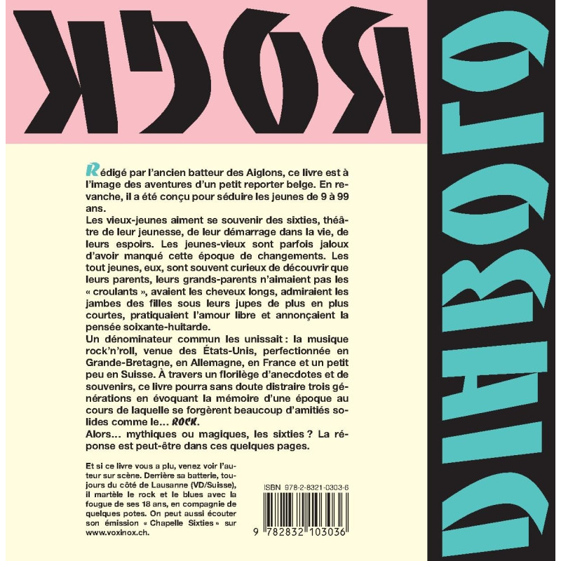 Rédigé par l'ancien batteur des Aiglons, ce livre est à l'image des aventures d'un petit reporter belge. En revanche, il a été conçu pour séduire les jeunes de 9 à 99 ans. Les vieux-jeunes aiment se souvenir des sixties, théâtre de leur jeunesse, de leur démarrage dans la vie, de leurs espoirs. Les jeunes-vieux sont parfois jaloux d'avoir manqué cette époque de changements. Les tout jeunes, eux, sont souvent curieux de découvrir que leurs parents, leurs grands-parents n'aimaient pas les " croulants ", avaient les cheveux longs, admiraient les jambes des filles sous leurs jupes de plus en plus courtes, pratiquaient l'amour libre et annonçaient la pensée soixante-huitarde. Un dénominateur commun les unissait : la musique rock'n'roll, venue des États-Unis, perfectionnée en Grande-Bretagne, en Allemagne, en France et un petit peu en Suisse. À travers un florilège d'anecdotes et de souvenirs, ce livre pourra sans doute distraire trois générations en évoquant la mémoire d'une époque au cours de laquelle se forgèrent beaucoup d'amitiés solides comme le… ROCK. Alors… mythiques ou magiques, les sixties ? La réponse est peut-être dans ces quelques pages. // Et si ce livre vous a plu, venez voir l'auteur sur scène. Derrière sa batterie, toujours du côté de Lausanne (VD/Suisse), il martèle le rock et le blues avec la fougue de ses 18 ans, en compagnie de quelques potes. On peut aussi écouter son émission " Chapelle Sixties " sur www.voxinox.ch.