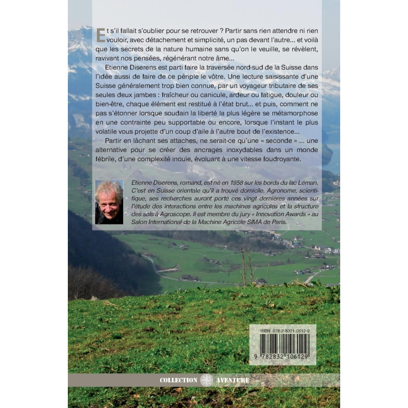 Et s’il fallait s’oublier pour se retrouver ? Partir sans rien attendre ni rien vouloir, avec détachement et simplicité, un pas devant l’autre… et voilà que les secrets de la nature humaine sans qu’on le veuille, se révèlent, ravivant nos pensées, régénérant notre âme… Etienne Diserens est parti faire la traversée nord-sud de la Suisse dans l’idée aussi de faire de ce périple le vôtre. Une lecture saisissante d’une Suisse généralement trop bien connue, par un voyageur tributaire de ses seules deux jambes : fraîcheur ou canicule, ardeur ou fatigue, douleur ou bien-être, chaque élément est restitué à l’état brut… et puis, comment ne pas s’étonner lorsque soudain la liberté la plus légère se métamorphose en une contrainte peu supportable ou encore, lorsque l’instant le plus volatile vous projette d’un coup d’aile à l’autre bout de l’existence…Partir en lâchant ses attaches, ne serait-ce qu’une « seconde » … une alternative pour se créer des ancrages inoxydables dans un monde fébrile, d’une complexité inouïe, évoluant à une vitesse foudroyante.
