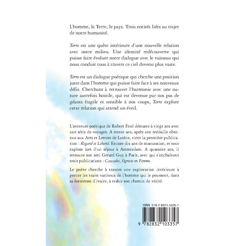 L'homme, la Terre, le pays. Trois entités liées au trajet de notre humanité. Terre est la quête intérieure à la recherche d'une nouvelle relation avec notre milieu. Une identité redécouverte qui puisse faire évoluer notre dialogue avec le vaisseau qui nous conduit tous à travers ce ciel devenu plus vaste. Terre est un dialogue poétique qui cherche une position juste dans l'homme qui puisse faire face à ses nouveaux défis. Cherchant à retrouver l'harmonie avec une nature autrefois hostile, qui est devenue par nos pas de géant fragile et sensible à nos coups, Terre explore cette relation qui attend un éveil. L'aventure poétique de Robert Fred démarre à vingt ans avec une série de voyage. A trente ans, après une médaille obtenue aux Arts et Lettres de Lutèce, vient la première publication : " Regard et Liberté ". Encore dix ans de maturation, et tout explose lors d'un séjour à Amsterdam. A quarante ans, il retrouve son ami Gérard Guy à Paris, avec qui s'enchaînent trois publications : " Cascades ", " Ogresse " et " femme ". Le poète cherche à travers une exploration intérieure à percer les traits vaniteux de l'homme qui le pousse dans sa forteresse d'ivoire à trahir son chemin de vérité.