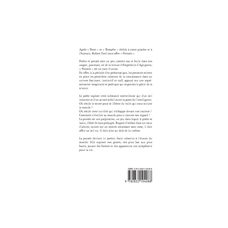 Après Terre et Tempête dédiés à notre planète et à l'humain, Robert Fred nous offre Pensers. Poésie et pensée sont un peu comme eau et huile dans nos usages, pourtant, né de la lecture d'Empédocle d'Agrigente, Pensers est un trait d'union. En effet, à la période dite présocratique, les penseurs mirent en place les premières colonnes de la connaissance dans un univers fascinant, instinctif et naïf, appuyé sur une représentation imaginaire et poétique qui engendra le génie de la science. Le poète explore cette substance merveilleuse qui, d'un œil innocent et d'un accord subtil, ouvre la porte de l'intelligence. Où réside le secret pour se libérer du voile qui nous occulte le monde? Où réside cette lucidité qui s'échappe devant nos craintes? Comment s'éveiller au monde pour y trouver son regard? La pensée est une palpitation, un jeu dans lequel le poète se lance, libéré de tous préjugés. Regard d'enfant dans un cœur d'adulte, ouvert sur un monde renaissant sans cesse, il doit offrir un œil nu. Il doit aller au-delà de lui-même. La pensée devient ici poésie, force créatrice à l'écoute du monde. Elle explore nos gestes, des plus bas aux plus hauts, jouant des formes et des apparences une symphonie pour la vie.