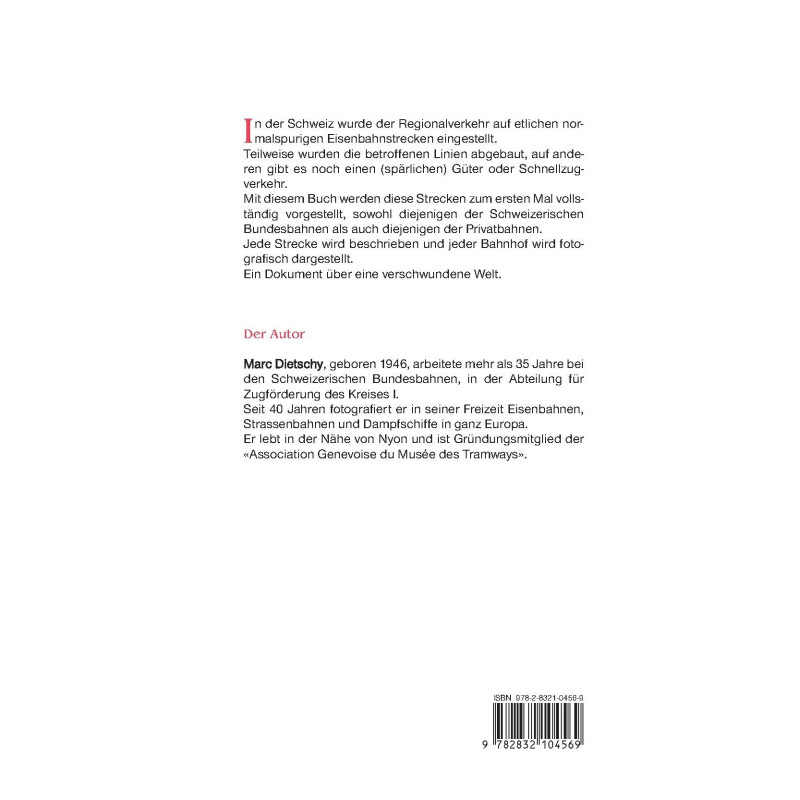 In der Schweiz wurde der Regionalverkehr auf etlichen normalspurigen Eisenbahnstrecken eingestellt. Teilweise wurden die betroffenen Linien abgebaut, auf anderen gibt es noch einen (spärlichen) Güter oder Schnellzugverkehr. Mit diesem Buch werden diese Strecken zum ersten Mal vollständig vorgestellt, sowohl diejenigen der Schweizerischen Bundesbahnen als auch diejenigen der Privatbahnen. Jede Strecke wird detailliert beschrieben. Ein Dokument über eine verschwundene Welt. Der Autor , geboren 1946, arbeitete mehr als 35 Jahre bei den Schweizerischen Bundesbahnen, in der Abteilung für Zugförderung des Kreises I. Seit 40 Jahren fotografiert er in seiner Freizeit Eisenbahnen, Strassenbahnen und Dampfschiffe in ganz Europa. Er lebt in der Nähe von Nyon und ist Gründungsmitglied der "Association Genevoise du Musée des Tramways".