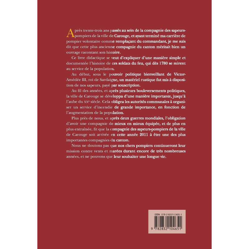 Après trente-trois ans passés au sein de la compagnie des sapeurs-pompiers de la ville de Carouge, et ayant terminé ma carrière de pompier volontaire comme remplaçant du commandant, je me suis dit que cette plus ancienne compagnie du canton méritait bien un ouvrage racontant son histoire. Ce livre didactique se veut d`expliquer d`une manière simple et documentée l`histoire de ces soldats du feu, qui dès 1780 se mirent au service de la population. Au début, sous le pouvoir politique bienveillant de Victor- Amédée III, roi de Sardaigne, un matériel rustique fut mis à disposition de nos sapeurs, payé par souscription. Au fil des années, et après plusieurs bouleversements politiques, la ville de Carouge se développa d`une manière importante, jusqu`à l`aube du XXe siècle. Cela obligea les autorités communales à organiser un service d`incendie de grande importance, en fonction de l`augmentation de la population. Plus près de nous, et après deux guerres mondiales, l`obligation d`avoir une compagnie de mieux en mieux équipée, et de plus en plus entraînée, fit que la compagnie des sapeurs-pompiers de la ville de Carouge soit arrivée en cette année 2011 à être une des plus importantes compagnies du canton. Nous ne doutons pas que nos chers pompiers continueront leur mission contre vents et marées durant encore de très nombreuses années, et ne pouvons que leur souhaiter une longue vie.
