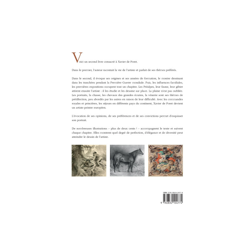 Voici un second ouvrage consacré à Xavier de Poret. Le premier évoquait la vie et l`œuvre de l`artiste, l`un des plus complets et des plus variés de son temps. Le second raconte les années d`une formation interrompue par la guerre, ses premières expositions, ses pérégrinations dans les Préalpes, ses portraits, les commandes royales, sa carrière européenne, la vénerie, les grandes écuries, les influences, les expositions. C`est un pèlerinage aux sources qui l`ont inspiré à travers un grand nombre de dessins souvent inédits, l`analyse des lignes de force d`une œuvre passionnante par sa diversité.