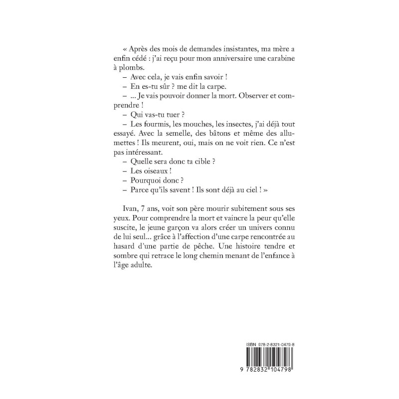 « Après des mois de demandes insistantes, ma mère a enfin cédé: j`ai reçu pour mon anniversaire une carabine à plombs. -Avec cela, je vais enfin savoir ! -En es-tu sûr ? me dit la carpe. -...Je vais pouvoir donner la mort. Observer et comprendre ! -Qui vas-tu tuer ? -Les fourmis, les mouches, les insectes, j`ai déjà tout essayé. Avec la semelle, des bâtons et même des allumettes! Ils meurent, oui, mais on ne voit rien. Ce n`est pas intéressant. -Quelle sera donc ta cible ? -Les oiseaux ! -Pourquoi donc ? -Parce qu’ils savent ! Ils sont déjà au ciel ! »