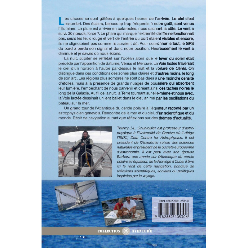 Les choses se sont gâtées à quelques heures de l’arrivée. Le ciel s’est assombri. Des éclairs, beaucoup trop fréquents à notre goût, sont venus l’illuminer. La pluie est arrivée en cataractes, nous cachant la côte. Le vent a suivi, 30 nœuds, force 7. Le phare qui marque l’extrémité de l’île ne fonctionnait pas, seuls les feux rouge et vert de l’entrée du port étaient visibles et encore, ils ne clignotaient pas comme ils auraient dû. Pour couronner le tout, le GPS du bord a perdu son signal et donc notre position. Heureusement le vent a diminué et je savais où nous étions. La nuit, Jupiter se reflétait sur l’océan alors que le lever du soleil était précédé par l’apparition de Saturne, Vénus et Mercure. La Voie Lactée traversait le ciel d’un horizon à l’autre par-dessus le mât et la voilure de Cérès. On distingue dans ces conditions des zones plus claires et d’autres moins, le long de son arc. Les régions plus sombres ne sont pas dues à une moindre densité d’étoiles, mais à la présence de grands nuages de poussière qui absorbent la lumière, l’empêchant de nous parvenir et créant ainsi ces taches noires le long de la Galaxie. Au fil de la nuit, la Terre tournant sur elle même et nous avec, la Voie Lactée dessinait un lent ballet dans le ciel, animé par les oscillations du bateau sur la mer. Un grand tour de l’Atlantique du cercle polaire à l’équateur raconté par un astrophysicien genevois. Rencontre de la mer et du ciel, d’un scientifique et du monde. Récit de navigation autant que réflexions sur des thèmes d’actualité. Thierry J.-L. Courvoisier est professeur d’astrophysique à l’Université de Genève où il dirige l’ISDC, Data Centre for Astrophysics. Il est président de l’Académie suisse des sciences naturelles et président de la société européenne d’astronomie. Il est parti avec son épouse Barbara une année sur l’Atlantique du cercle polaire à l’équateur, de la Norvège à Cuba. Il livre ici le récit de cette navigation, ponctué de réflexions scientifiques, sociales ou politiques inspirées par le voyage.