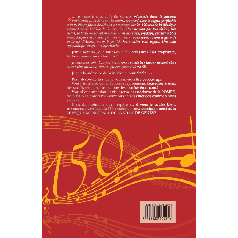 « … Je remonte à la salle du Comité, m’assieds dans le fauteuil présidentiel et, la tête dans les mains, le regard dans le vague, je réfléchis à la meilleure façon de débuter cet ouvrage sur les 150 ans de la Musique municipale de la Ville de Genève. Les idées ne sont pas très claires, très nettes, la tâche me paraît immense. C’est alors que, soudain, derrière le plus vieux drapeau de la musique, une « lueur », vous savez, comme le génie de la lampe d’Aladin ou de la fée Clochette, attire mon regard. Une voix sympathique surgit et m’apostrophe : Jeune homme, que faites-vous ici ? Vous avez l’air emprunté, torturé, puis-je vous êtes utile ?