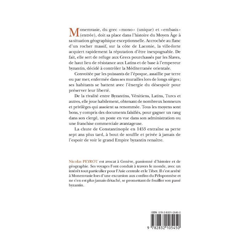 Monemvasie, du grec «mono» (unique) et « embasis » (entrée), doit sa place dans l’histoire du Moyen Âge à sa situation géographique exceptionnelle. Accrochée au flanc d’un rocher massif, sur la côte de Laconie, la ville-forte acquiert rapidement la réputation d’être inexpugnable. De fait, elle sert de refuge aux Grecs pourchassés par les Slaves, de haut lieu de résistance aux Latins et de base à l’empereur byzantin, décidé à contrôler la Méditerranée orientale. Convoitée par les puissants de l’époque, assaillie par terre ou par mer, enfermée dans ses murailles lors de longs sièges ; ses habitants se battent avec l’énergie du désespoir pour préserver leur liberté. De la rivalité entre Byzantins, Vénitiens, Latins, Turcs et autres, elle joue habilement, obtenant de nombreux honneurs et privilèges qui assoient sa renommée. Tous les moyens sont bons, y compris des documents falsifiés, pour gagner un rang dans son clergé, un poste en vue dans son administration ou une franchise commerciale avantageuse. La chute de Constantinople en 1453 entraîne sa perte sept ans plus tard, à bout de souffle et privée à jamais de l’espoir de voir le grand Empire byzantin renaître.