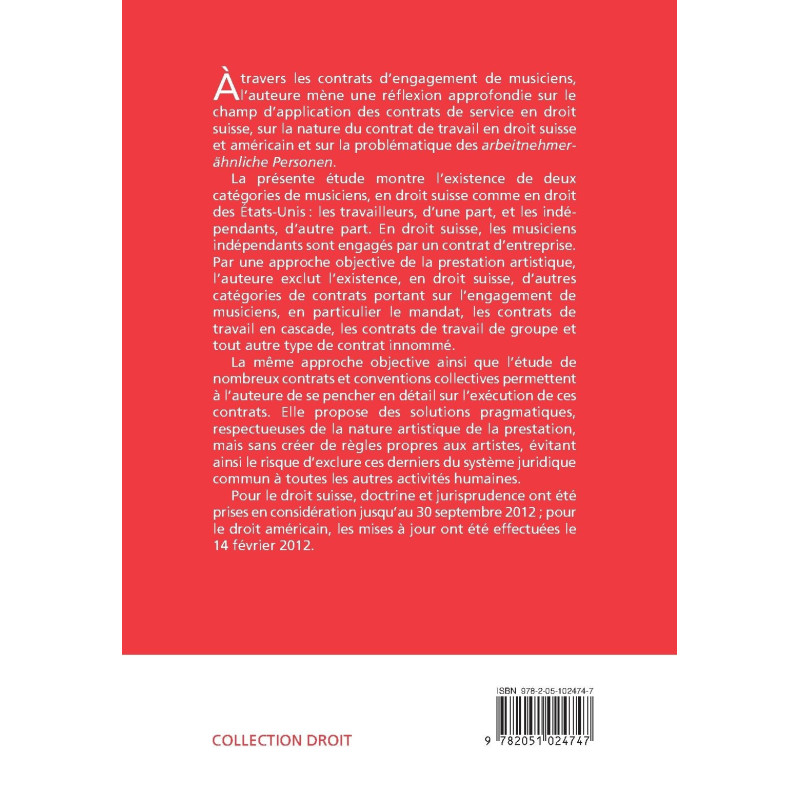 À travers les contrats d’engagement de musiciens, l’auteure mène une réflexion approfondie sur le champ d’application des contrats de service en droit suisse, sur la nature du contrat de travail en droit suisse et américain et sur la problématique des « arbeit nehmer - ähnliche Personen ». La présente étude montre l’existence de deux catégories de musiciens, en droit suisse comme en droit des États- Unis : les travailleurs, d’une part, et les indépendants, d’autre part. En droit suisse, les musiciens indépendants sont engagés par un contrat d’entreprise. Par une approche objective de la prestation artistique, l’auteure exclut l’existence, en droit suisse, d’autres catégories de contrats portant sur l’engagement de musiciens, en particulier le mandat, les contrats de travail en cascade, les contrats de travail de groupe et tout autre type de contrat innommé. La même approche objective ainsi que l’étude de nombreux contrats et conventions collectives permettent à l’auteure de se pencher en détail sur l’exécution de ces contrats. Elle propose des solutions pragmatiques, respectueuses de la nature artistique de la prestation, mais sans créer de règles propres aux artistes, évitant ainsi le risque d’exclure ces derniers du système juridique commun à toutes les autres activités humaines. Pour le droit suisse, doctrine et jurisprudence ont été prises en considération jusqu’au 30 septembre 2012 ; pour le droit américain, les mises à jour ont été effectuées le 14 février 2012.