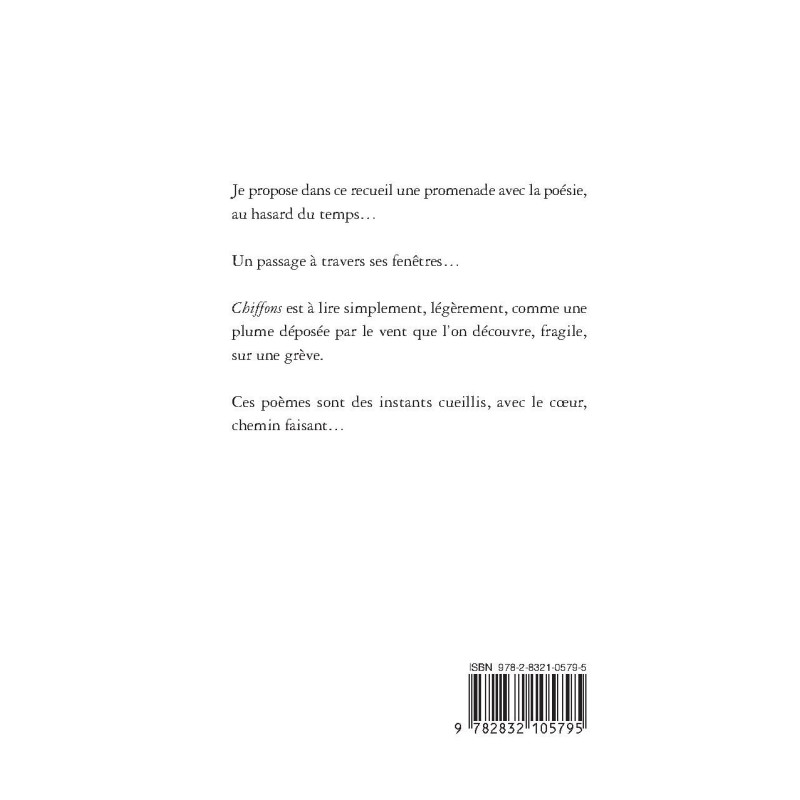Chiffons est à lire simplement, légèrement, comme une plume déposée par le vent que l`on découvre, fragile, sur une grève.