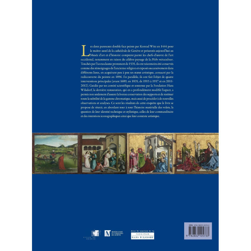 Les deux panneaux double-face peints par Konrad Witz en 1444 pour le maître-autel de la cathédrale de Genève et présentés aujourd’hui au Musée d’art et d’histoire comptent parmi les chefs-d’œuvre de l’art occidental, notamment en raison du célèbre paysage de la « Pêche miraculeuse ». Touchés par l’iconoclasme protestant de 1535, ils ont néanmoins été conservés comme des témoignages de l’ancienne religion et exposés successivement dans différents lieux, en acquérant peu à peu un statut artistique, consacré par la redécouverte du peintre en 1896. En parallèle, ils ont fait l’objet de quatre interventions principales (avant 1689, 1835, 1915-1917 et 2011-2012). Guidée par un comité scientifique et soutenue par la Fondation Hans Wilsdorf, la dernière restauration, qui en a profondément modifié l’aspect, a permis non seulement d’assurer la bonne conservation des supports et de restituer toute la subtilité de la gamme chromatique, mais aussi de procéder à de nouvelles observations et analyses. Ce sont les résultats de cette enquête que le livre se propose de réunir, en abordant tour à tour l’histoire matérielle des volets, la question de leur identité technique et stylistique, celle de leur commanditaire et des intentions iconographiques ainsi que leur contexte artistique.