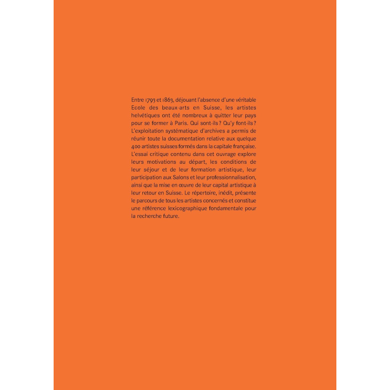Entre 1793 et 1863, déjouant l’absence d’une véritable Ecole des beaux-arts en Suisse, les artistes helvétiques ont été nombreux à quitter leur pays pour se former à Paris. Qui sont-ils ? Qu’y font-ils ? L’exploitation systématique d’archives a permis de réunir toute la documentation relative aux quelque 400 artistes suisses formés dans la capitale française. L’essai critique contenu dans cet ouvrage explore leurs motivations au départ, les conditions de leur séjour et de leur formation artistique, leur participation aux Salons et leur professionnalisation, ainsi que la mise en œuvre de leur capital artistique à leur retour en Suisse. Le répertoire, inédit, présente le parcours de tous les artistes concernés et constitue une référence lexicographique fondamentale pour la recherche future.