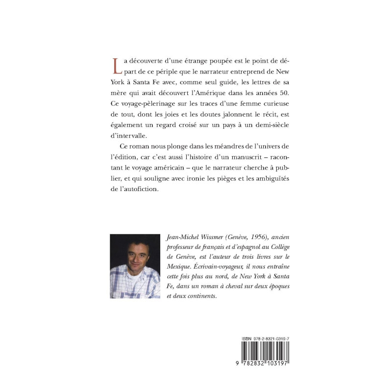 La découverte d'une étrange poupée est le point de départ de ce périple que le narrateur entreprend de New York à Santa Fe avec, comme seul guide, les lettres de sa mère qui avait découvert l'Amérique dans les années 50. Ce voyage-pèlerinage sur les traces d'une femme curieuse de tout, dont les joies et les doutes jalonnent le récit, est également un regard croisé sur un pays à un demi-siècle d'intervalle. Ce roman nous plonge dans les méandres de l'univers de l'édition, car c'est aussi l'histoire d'un manuscrit - racontant le voyage américain - que le narrateur cherche à publier, et qui souligne avec ironie les pièges et les ambiguïtés de l'autofiction. Jean-Michel Wissmer (Genève, 1956), ancien professeur de français et d'espagnol au Collège de Genève, est l'auteur de trois livres sur le Mexique. Écrivain-voyageur, il nous entraîne cette fois plus au nord, de New York à Santa Fe, dans un roman à cheval sur deux époques et deux continents.