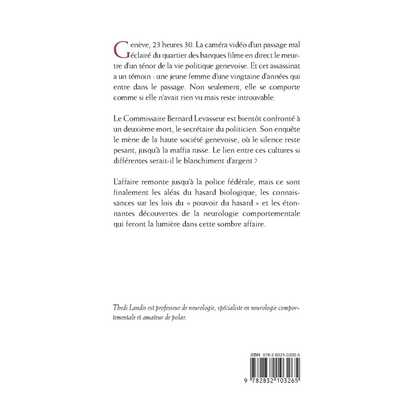 Genève, 23heures 30. La caméra vidéo d`un passage mal éclairé du quartier des banques filme en direct le meurtre d`un ténor de la vie politique genevoise. Et cet assassinat a un témoin : une jeune femme d`une vingtaine d`années qui entre dans le passage, à droite de l`écran. Bernard Levasseur, à qui l`enquête est confiée, va tout mettre en œuvre pour retrouver ce témoin. De la haute société genevoise à la mafia russe. L`enquête stagne jusqu`au jour où les connaissances sur les lois du "pouvoir du hasard" d`un professeur de neurologie comportementale feront la lumière dans cette sombre affaire. Thedi Landis est professeur de neurologie et de neuropsychologie et un amateur de polar.