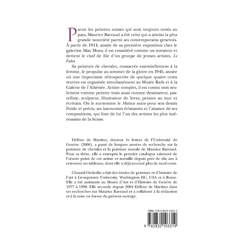 Parmi les peintres suisses qui sont toujours restés au pays, Maurice Barraud a été celui qui a atteint la plus grande notoriété parmi ses contemporains genevois. À partir de 1914, année de sa première exposition chez le galeriste Max Moos, il est considéré comme un novateur et devient le chef de file d'un groupe de jeunes artistes, Le Falot. Sa peinture de chevalet, consacrée essentiellement à la femme, le propulse au sommet de la gloire en 1945, année où une importante rétrospective de quelque quatre cents œuvres est organisée simultanément au Musée Rath et à la Galerie de l'Athénée. Artiste complet, il est connu non seulement comme peintre mais aussi comme dessinateur, pastelliste, sculpteur, illustrateur de livres, peintre au mur et écrivain. On le surnomme le Matisse suisse pour son dessin fluide et précis, ses harmonies éclatantes et l'aisance de ses compositions, qui font de lui l'un des artistes les plus intéressants de la Suisse. Hélène de Martino, docteur ès lettres de l'Université de Genève (2006), a passé de longues années de recherche sur la peinture de chevalet et la peinture murale de Maurice Barraud. Pour sa thèse, elle a entrepris le premier catalogue raisonné de l'oeuvre peint de cet artiste et travaille depuis près de dix ans à retrouver ses tableaux, dont elle a déjà recensé plus de neuf cents. Chantal Oederlin a fait des études de peinture et d'histoire de l'art à Georgetown University, Washington DC, USA. Elle a été assistante au Musée d'Art et d'Histoire de Genève de 1977 à 1990. Elle seconde depuis 2004 Hélène de Martino dans ses recherches sur Maurice Barraud et a collaboré à la mise en forme du présent ouvrage