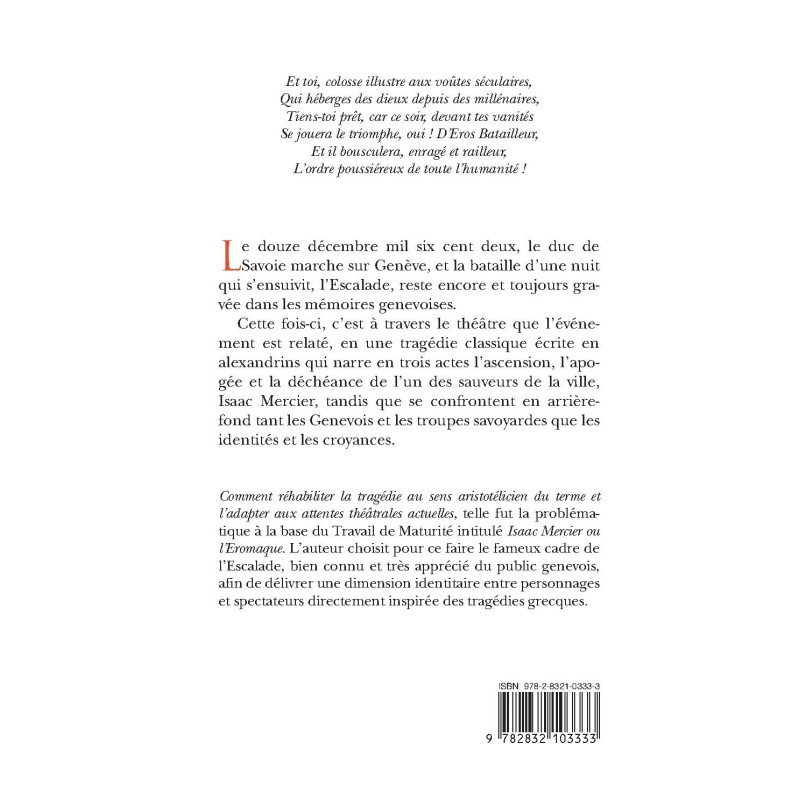 Le douze décembre mil six-cents deux, le duc de Savoie marche sur Genève, et la bataille d'une nuit qui s'ensuivit, l'Escalade, reste encore et toujours gravée dans les mémoires genevoises. Cette fois-ci, c'est à travers le théâtre que l'événement est relaté, en une tragédie classique écrite en alexandrins qui narre en trois actes l'ascension, l'apogée et la déchéance de l'un des sauveur de la ville, Isaac Mercier, tandis que se confrontent en arrière-fond tant les Genevois et les troupes savoyardes que les identités et les croyances. Comment réhabiliter la tragédie au sens aristotélicien du terme et l'adapter aux attentes théâtrales actuelles, telle fut la problématique à la base du Travail de Maturité intitulé Isaac Mercier ou l'Eromaque. L'auteur choisit pour ce faire le fameux cadre de l'Escalade, bien connu et très apprécié du public genevois, afin de délivrer une dimension identitaire entre personnages et spectateurs directement inspirée des tragédies grecques.