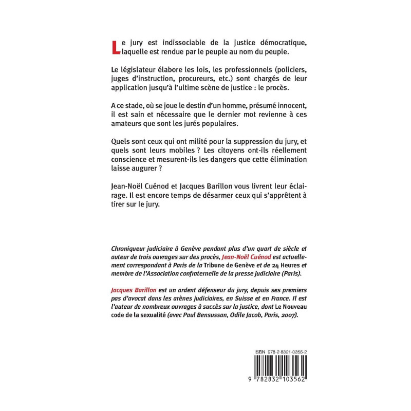 Le jury est indissociable de la justice démocratique, laquelle est rendue par le peuple au nom du peuple. Le législateur élabore les lois, les professionnels (policiers, juges d'instruction, procureurs, etc) sont chargés de leur application jusqu'à l'ultime scène de justice : le procès. A ce stade, où se joue le destin d'un homme, présumé innocent, il est sain et nécessaire que le dernier mot revienne à ces amateurs que sont les jurés populaires. Quels sont ceux qui ont milité pour la suppression du jury, et quels sont leurs mobiles ? Les citoyens ont-ils réellement conscience et mesurent-ils les dangers que cette élimination laisse augurer ? Jean-Noël Cuénod et Jacques Barillon vous livrent leur éclairage. Il est encore temps de désarmer ceux qui s'apprêtent à tirer sur le jury. Chroniqueur judiciaire à Genève pendant plus d'un quart de siècle et auteur de trois ouvrages sur des procès, Jean-Noël Cuénod est actuellement correspondant à Paris de la Tribune de Genève et de 24 heures et membre de la l'Association confraternelle de la presse judiciaire (Paris). Jacques Barillon est un ardent défenseur du jury, depuis ses premiers pas d'avocat dans les arènes judiciaires, en Suisse et en France. Il est l'auteur de très nombreux ouvrages sur la justice, dont Le Nouveau code de la sexualité (avec Paul Bensussan, Odile Jacob, Paris, 2007).