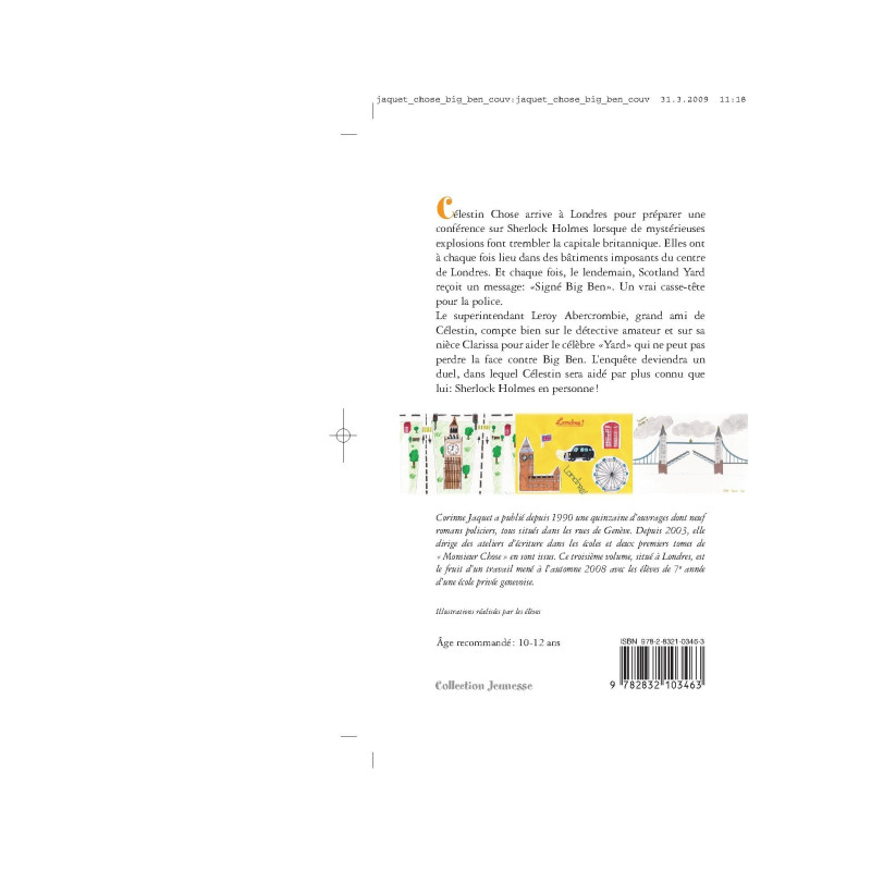 Célestin Chose arrive à Londres pour préparer une conférence sur Sherlock Holmes lorsque de mystérieuses explosions font trembler la capitale britannique. Elles ont à chaque fois lieu dans des bâtiments imposants du centre de Londres. Il n'y a pour le moment aucune victime à signaler, mais les dégâts sont de plus en plus importants. Et chaque fois, le lendemain, Scotland Yard reçoit un message: " Signé Big Ben ". Un vrai casse-tête pour la police. Le superintendant Leroy Abercrombie, grand ami de Célestin, compte bien sur le détective amateur et sur sa nièce Clarissa pour aider le célèbre " Yard" "qui ne peut pas perdre la face contre Big Ben. L'enquête deviendra un duel, dans lequel Célestin sera aidé par plus connu que lui: Sherlock Holmes en personne! Corinne Jaquet a publié depuis 1990 une quinzaine d'ouvrages dont 9 romans policiers, tous situés dans les rues de Genève. Depuis 2003, elle donne des ateliers d'écriture dans les écoles et deux premiers tomes de " Monsieur Chose " en sont issus. Ce troisième volume, situé à Londres, est le fruit d'un travail mené à l'automne 2008 avec les élèves de 7e année d'une école privée genevoise.