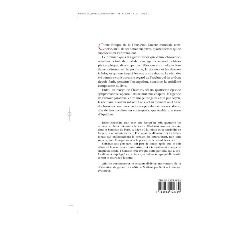 Cette fresque de la Deuxième Guerre mondiale comporte, au fil de ses douze chapitres, quatre thèmes qui se succèdent ou s'entremêlent. Le premier, qui a la rigueur historique d'une chronique, constitue la toile de fond de l'ouvrage. Le second, politicophilosophique, développe des réflexions sur quelques fondamentalismes, sur le pacifisme, la violence et les diverses idéologies qui ont inspiré les acteurs du drame. Le récit des événements vus à travers le regard de l'enfant qui les a vécus depuis Paris, pendant l'occupation, constitue la troisième composante du livre. Enfin, en marge de l'histoire, tel un quatrième épisode symptomatique, apparaît, dès le huitième chapitre, la légende de l'amour paradoxal entre une jeune Juive et un pur Aryen, fils de nazis. L'auteur introduit ce sujet au moment où il traite des horreurs commises par les adeptes du national-socialisme, afin de leur conférer un contrepoids, qui rétablit une sorte d'équilibre. René Koechlin avait sept ans lorsqu'en juin quarante les armées de Hitler ont envahi la France. Il habitait, avec ses parents, dans la banlieue de Paris. A l'âge où la raison et la sensibilité se forgent, il vécut intensément l'occupation allemande et les événements qui enflammèrent le monde, les interprétant, non sans rigueur, avec l'imagination et la poésie de la pré-adolescence. Soixante ans plus tard, soit peu de temps après que se soit effondré le marxisme communiste, qui a intensément marqué le vingtième siècle, l'homme mûr évoque cette période, qui a profondément imprégné son enfance, en même temps qu'elle bouleversait le cours de l'histoire.