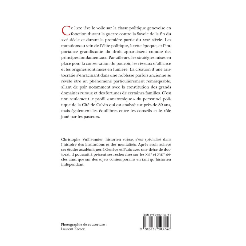 Ce livre lève le voile sur la classe politique genevoise en fonction durant la guerre contre la Savoie de la fin du XVIe siècle et durant la première partie du XVIIe siècle. Les mutations au sein de l'élite politique, à cette époque, et l'importance grandissante du droit apparaissent comme des principes fondamentaux. Par ailleurs, les stratégies mises en place pour la conservation du pouvoir, les réseaux d'alliance et les origines sont mises en lumière. La création d'une aristocratie s'enracinant dans une noblesse parfois ancienne se révèle être un phénomène particulièrement remarquable, allant de pair notamment avec la constitution des grands domaines ruraux et des fortunes de certaines familles. C'est non seulement le profil " anatomique " du personnel politique de la Cité de Calvin qui est analysé sur près de 80 ans, mais également les équilibres entre les conseils et le rôle joué par les pasteurs. Christophe Vuilleumier, historien suisse, s'est spécialisé dans l'histoire des institutions et des mentalités. Après avoir achevé ses études académiques à Genève et Paris avec une thèse de doctorat, il poursuit à présent ses recherches sur les XVIe et XVIIe siècles ainsi que sur des sujets contemporains en tant qu'historien indépendant.