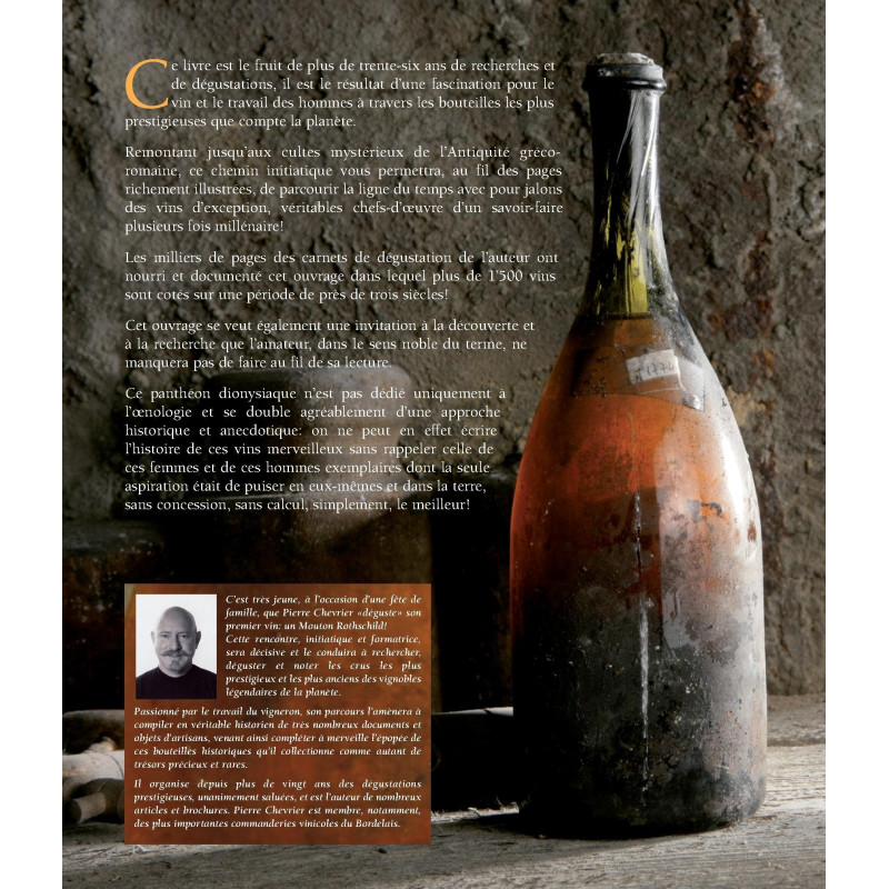 Ce livre est le fruit de plus de 36 ans de recherches et de dégustations, il est le résultat d'une fascination pour le vin et le travail des hommes à travers les bouteilles les plus prestigieuses que compte la planète. Remontant jusqu'aux cultes mystérieux de l'Antiquité gréco-romaine, ce chemin initiatique vous permettra, au fil des pages richement illustrées, de parcourir la ligne du temps avec pour jalons des vins d'exception, véritables chefs-d'œuvre d'un savoir-faire plusieurs fois millénaire! Les milliers de pages des carnets de dégustation de l'auteur ont nourri et documenté cet ouvrage dans lequel plus de 1'500 vins sont cotés sur une période de près de trois siècles! Cet ouvrage se veut également une invitation à la découverte et à la recherche que l'amateur, dans le sens noble du terme, ne manquera pas de faire au fil de sa lecture. Ce panthéon dionysiaque n'est pas dédié uniquement à l'œnologie et se double agréablement d'une approche historique et anecdotique: on ne peut en effet écrire l'histoire de ces vins merveilleux sans rappeler celle de ces femmes et de ces hommes exemplaires dont la seule aspiration était de puiser en eux-mêmes et dans la terre, sans concessions, sans calcul, simplement, le meilleur!