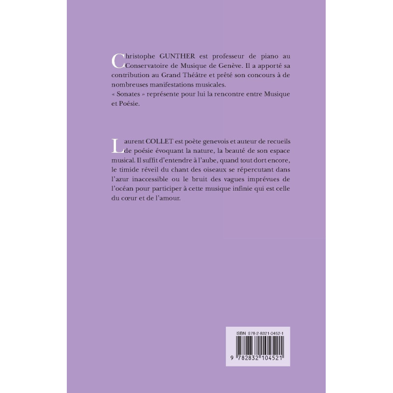 Christophe GUNTHER est professeur de piano au Conservatoire de Musique de Genève. Il a apporté sa contribution au Grand Théâtre et prêté son concours à de nombreuses manifestations musicales. " Sonates " représente pour lui la rencontre entre Musique et Poésie. Laurent COLLET est poète genevois et auteur de recueils de poésie évoquant la nature, la beauté de son espace musical. Il suffit d'entendre à l'aube quand tout dort encore, le timide réveil du chant des oiseaux se répercutant dans l'azur inaccessible ou le bruit des vagues imprévues de l'océan pour participer à cette musique infinie qui est celle du cœur et de l'amour.