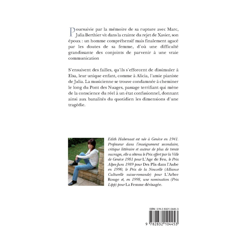 Poursuivie par la mémoire de sa rupture d`avec Marc, Julia Berthier vit dans la crainte d`un rejet : celui de Xavier devenu son époux ; un homme compréhensif, mais finalement agacé par les doutes de sa femme, d`où la difficulté grandissante des conjoints de parvenir à une vraie communication. Des failles s`ensuivent ; ils s`efforcent néanmoins de les dissimuler à Elsa, leur unique enfant. Egalement à Alicia, l`amie pianiste de Julia, la musicienne condamnée à cheminer le long du Pont des Nuages, ce passage terrifiant qui mène de la conscience du réel à un état confusionnel, donnant ainsi, aux banalités du quotidien, les dimensions d`une tragédie. Edith Habersaat est née à Genève en 1941. Professeur dans l`enseignement secondaire, critique littéraire et auteur de plus de trente ouvrages, elle a obtenu le Prix offert par la Ville de Genève 1981 pour L`Age de Feu, le Prix Alpes-Jura 1989 pour Des Plis dans l`Aube en 1990, le Prix de la Nouvelle (Alliance Culturelle suisse-romande) pour L`Arbre Rouge et en 1998, une nomination (Prix Lipp) pour La Femme dévisagée.