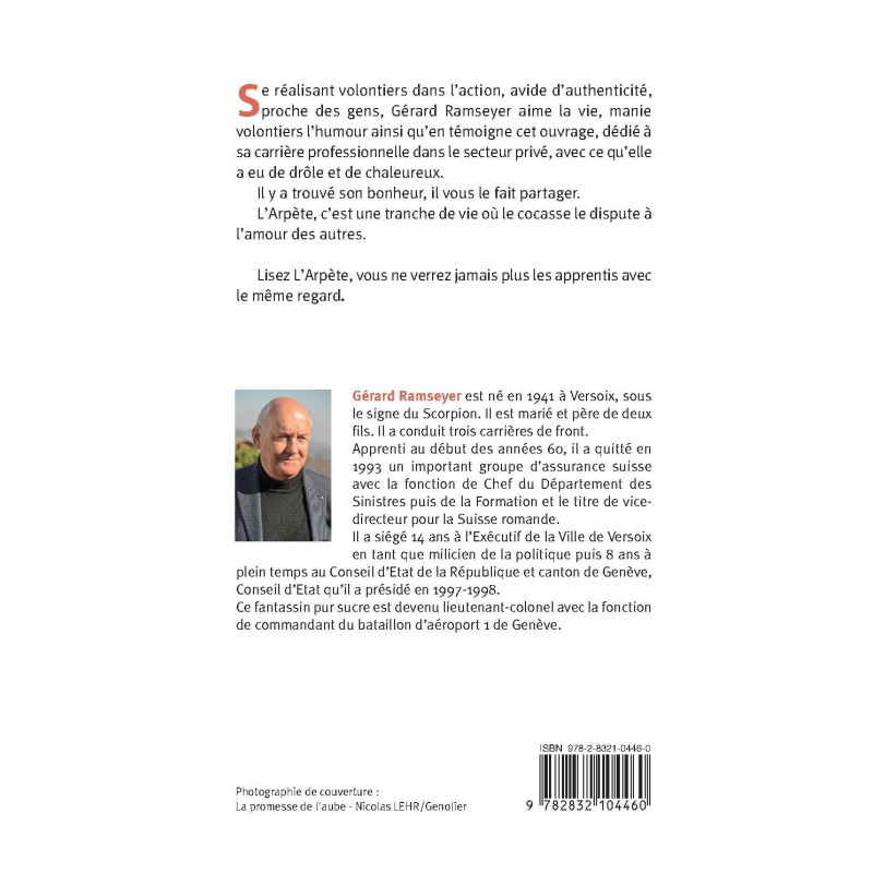 Se réalisant volontiers dans l`action, avide d`authenticité, proche des gens, Gérard Ramseyer aime la vie, manie volontiers l`humour ainsi qu`en témoigne cet ouvrage, dédié à sa carrière professionnelle dans le secteur privé, avec ce qu`elle a eu de drôle et de chaleureux. Il y a trouvé son bonheur, il vous le fait partager. L`Arpète, c`est une tranche de vie où le cocasse le dispute à l`amour des autres. Lisez L`Arpète, vous ne verrez jamais plus les apprentis avec le même regard. Gérard Ramseyer est né en 1941 à Versoix, sous le signe du Scorpion. Il est marié et père de deux fils. Il a conduit trois carrières de front. Apprenti au début des années 60, il a quitté en 1993 un important groupe d`assurance suisse avec la fonction de Chef du Département des Sinistres puis de la Formation et le titre de vice-directeur pour la Suisse romande. Il a siégé 14 ans à l`Exécutif de la Ville de Versoix en tant que milicien de la politique puis 8 ans à plein temps au Conseil d`État de la République et canton de Genève, Conseil d`État qu`il a présidé en 1997-1998. Ce fantassin pur sucre est devenu lieutenant-colonel avec la fonction de commandant du bataillon d`aéroport 1 de Genève.