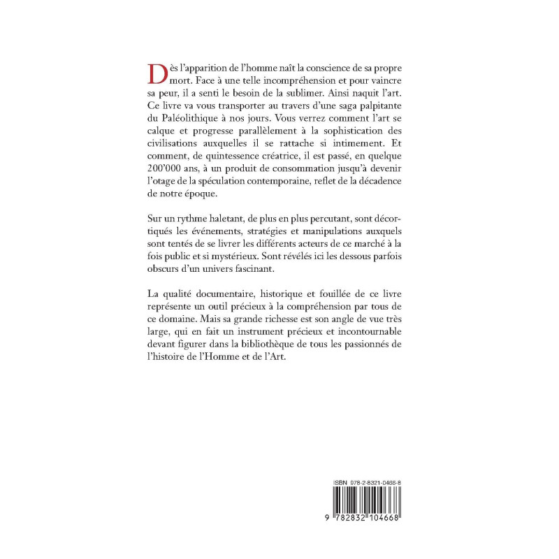 Dès l`apparition de l`homme naît la conscience de sa propre mort. Face à une telle incompréhension et pour vaincre sa peur, il a senti le besoin de la sublimer. Ainsi naquit l`art. Ce livre va vous transporter au travers d`une saga palpitante du Paléolithique à nos jours. Vous verrez comment l`art se calque et progresse parallèlement à la sophistication des civilisations auxquelles il se rattache si intimement. Et comment, de quintessence créatrice, il est passé, en quelque 200`000 ans, à un produit de consommation jusqu`à devenir l`otage de la spéculation contemporaine, reflet de la décadence de notre époque. Sur un rythme haletant, de plus en plus percutant, sont décortiqués les événements, stratégies et manipulations auxquels sont tentés de se livrer les différents acteurs de ce marché à la fois public et si mystérieux. Sont révélés ici les dessous parfois obscurs d`un univers fascinant. La qualité documentaire, historique et fouillée de ce livre représente un outil précieux à la compréhension par tous de ce domaine. Mais sa grande richesse est son angle de vue très large, qui en fait un instrument précieux et incontournable devant figurer dans la bibliothèque de tous les passionnés de l`histoire de l`Homme et de l`Art.