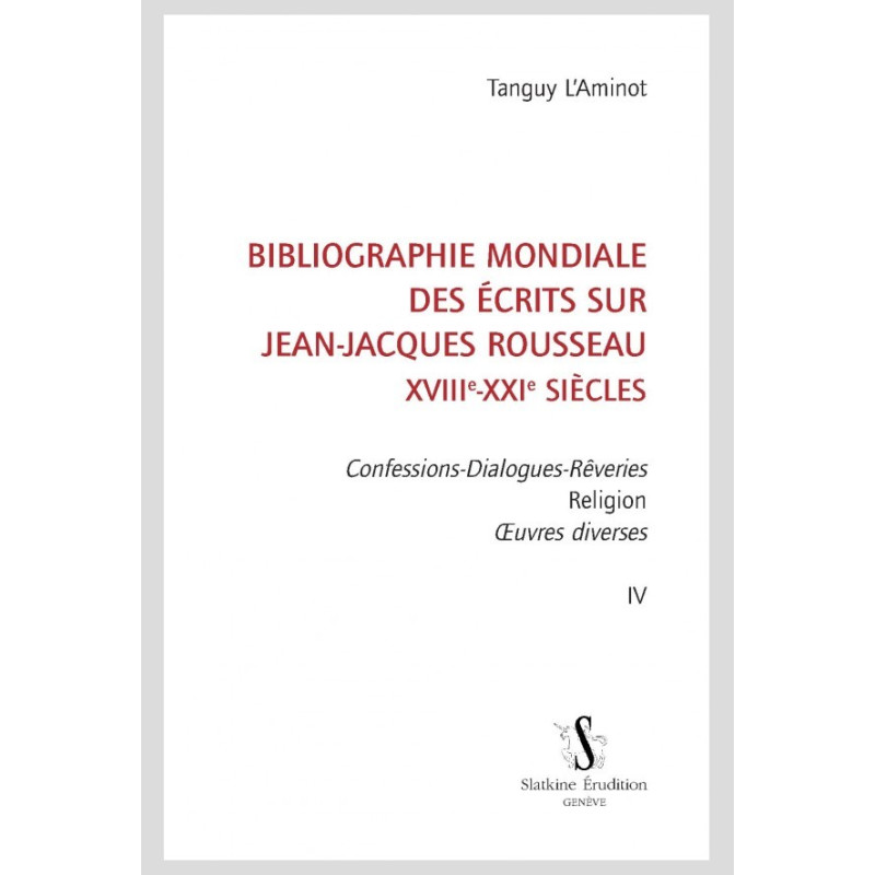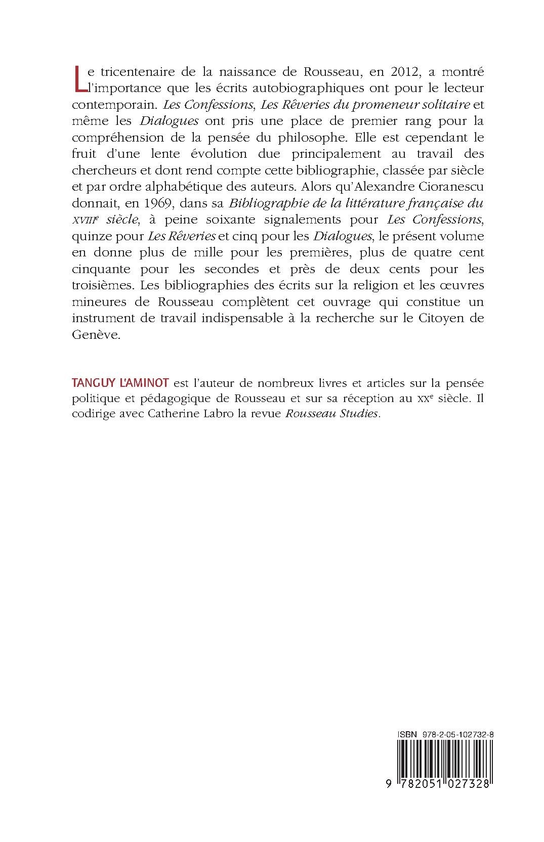 This bibliography of Rousseau studies, an indispensable reference tool for research on the Citizen of Geneva, emphasizes the increased importance of his autobiographical works (the Confessions, the Reveries of a Solitary Walker and the Dialogues) for contemporary readers and for their comprehension of his thought.