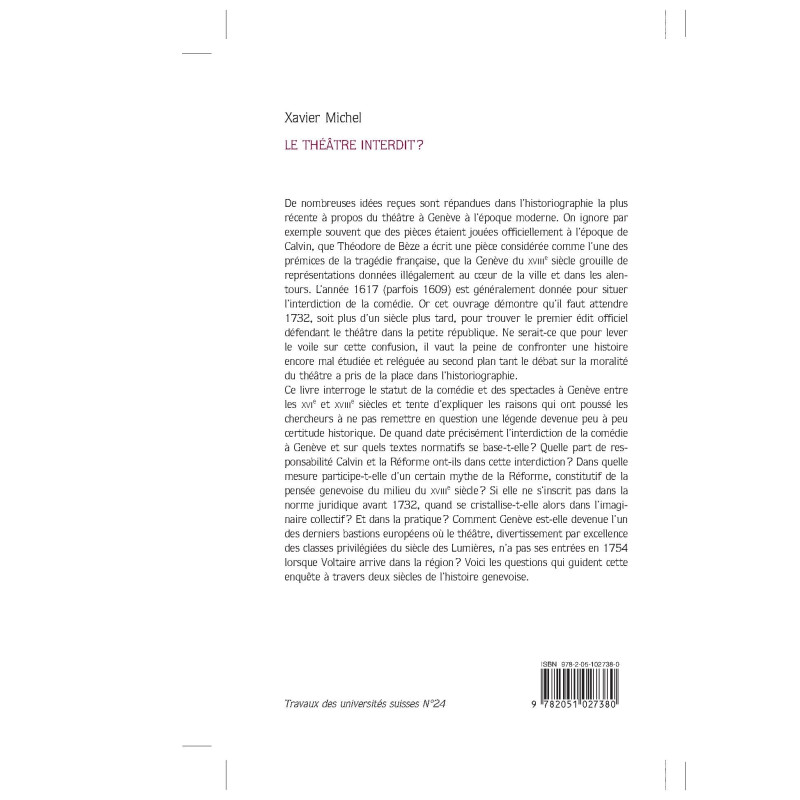 The origins of the ban on theatre in Geneva have never been fully investigated. This has led to several misconceptions: in fact, some plays were produced with official sanction at the time of Calvin; the city was brimming with illegal performances; the actual ban dates back to 1732 rather than 1617, etc.