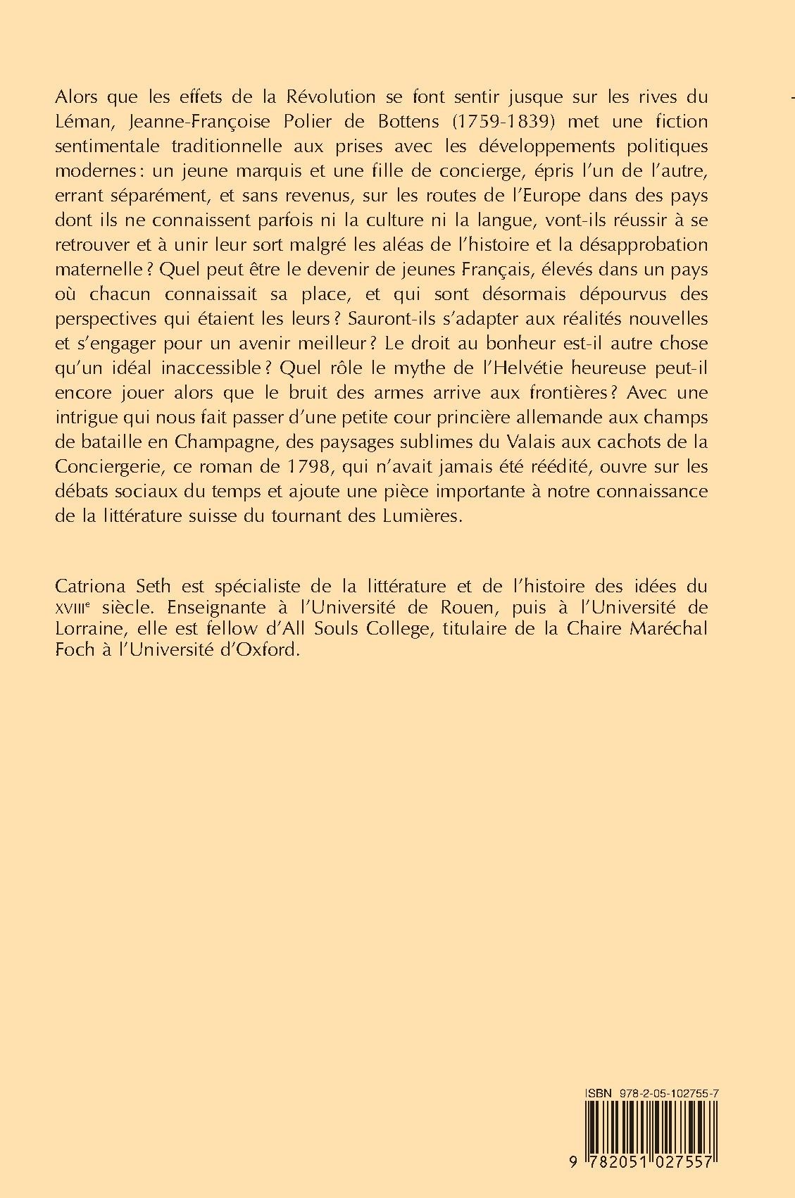 Alors que les effets de la Révolution se font sentir jusque sur les rives du Léman, Jeanne-Françoise Polier de Bottens (1759-1839) met une fiction sentimentale traditionnelle aux prises avec les développements politiques modernes : un jeune marquis et une fille de concierge, épris l’un de l’autre, errant séparément, et sans revenus, sur les routes de l’Europe dans des pays dont ils ne connaissent parfois ni la culture ni la langue, vont-ils réussir à se retrouver et à unir leur sort malgré les aléas de l’histoire et la désapprobation maternelle ? Quel peut être le devenir de jeunes Français, élevés dans un pays où chacun connaissait sa place, et qui sont désormais dépourvus des perspectives qui étaient les leurs ? Sauront-ils s’adapter aux réalités nouvelles et s’engager pour un avenir meilleur ? Le droit au bonheur est-il autre chose qu’un idéal inaccessible ? Quel rôle le mythe de l’Helvétie heureuse peut-il encore jouer alors que le bruit des armes arrive aux frontières ? Avec une intrigue qui nous fait passer d’une petite cour princière allemande aux champs de bataille en Champagne, des paysages sublimes du Valais aux cachots de la Conciergerie, ce roman de 1798, qui n’avait jamais été réédité, ouvre sur les débats sociaux du temps et ajoute une pièce importante à notre connaissance de la littérature suisse du tournant des Lumières.