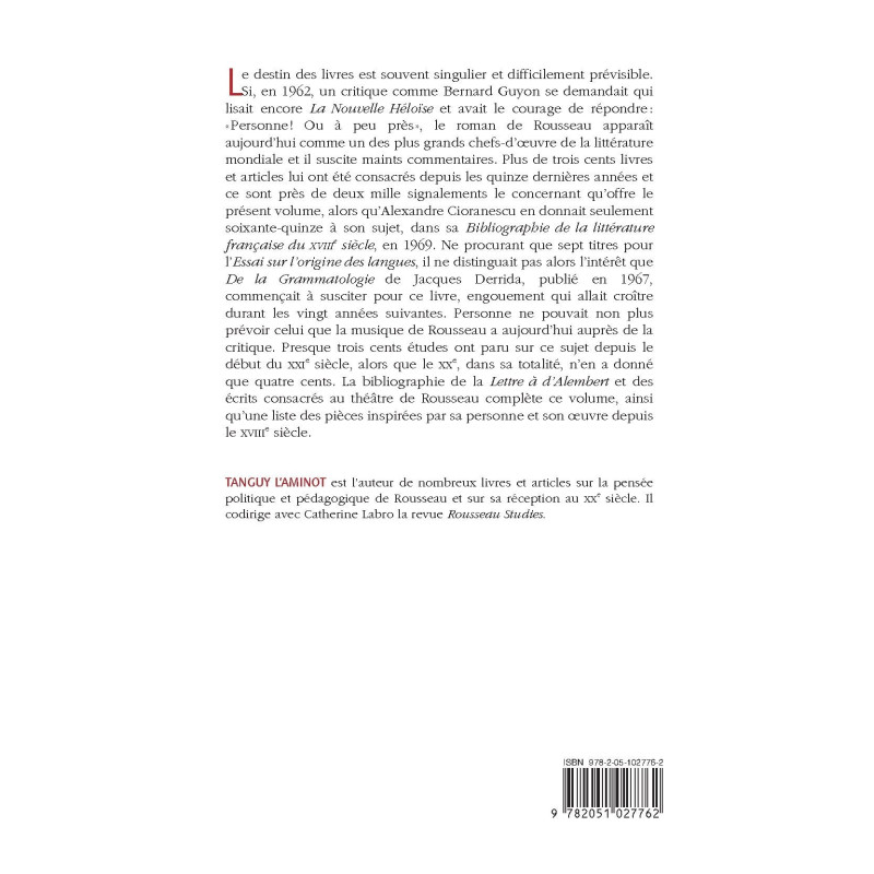 Le destin des livres est souvent singulier et difficilement prévisible. Si, en 1962, un critique comme Bernard Guyon se demandait qui lisait encore La Nouvelle Héloïse et avait le courage de répondre : «Personne! Ou à peu près», le roman de Rousseau apparaît aujourd’hui comme un des plus grands chefs-d'œuvre de la littérature mondiale et il suscite maints commentaires. Plus de trois cents livres et articles lui ont été consacrés depuis les quinze dernières années et ce sont près de deux mille signalements le concernant qu’offre le présent volume, alors qu’Alexandre Cioranescu en donnait seulement soixante-quinze à son sujet, dans sa Bibliographie de la littérature française du XVIIIe siècle, en 1969. Ne procurant que sept titres pour l’Essai sur l’origine des langues, il ne distinguait pas alors l’intérêt que De la Grammatologie de Jacques Derrida, publié en 1967, commençait à susciter pour ce livre, engouement qui allait croître durant les vingt années suivantes. Personne ne pouvait non plus prévoir celui que la musique de Rousseau a aujourd’hui auprès de la critique. Presque trois cents études ont paru sur ce sujet depuis le début du XXIe siècle, alors que le XXe, dans sa totalité, n’en a donné que quatre cents. La bibliographie de la Lettre à d’Alembert et des écrits consacrés au théâtre de Rousseau complète ce volume, ainsi qu’une liste des pièces inspirées par sa personne et son œuvre depuis le XVIIIe siècle.