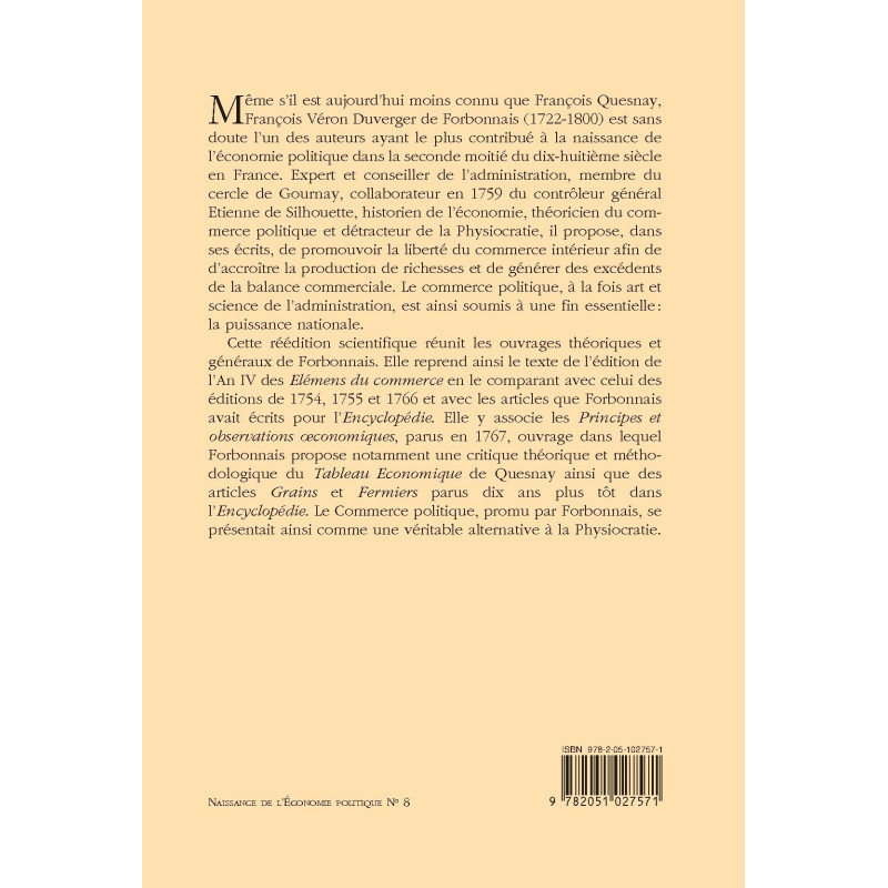 The writings of François Véron Duverger de Forbonnais, herein republished, were most instrumental to the emergence of political economy in 18th-century France. He advocated for free domestic trade so as to increase the production of riches and create trade surpluses, thereby increasing national power.