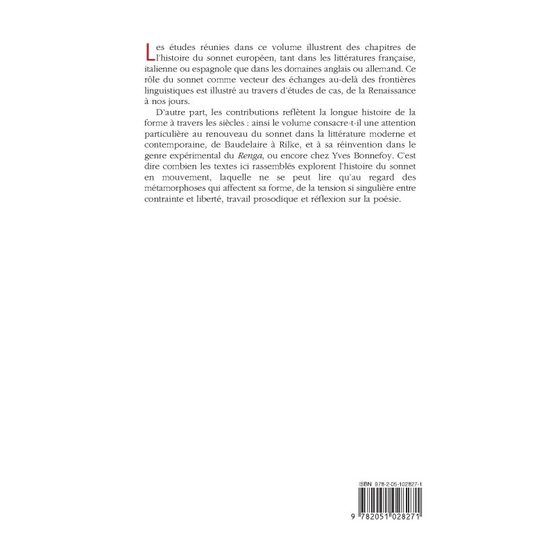 D’autre part, les contributions reflètent la longue histoire de la forme à travers les siècles : ainsi le volume consacre-t-il une attention particulière au renouveau du sonnet dans la littérature moderne et contemporaine, de Baudelaire à Rilke, et à sa réinvention dans le genre expérimental du Renga, ou encore chez Yves Bonnefoy. C’est dire combien les textes ici rassemblés explorent l’histoire du sonnet en mouvement, laquelle ne se peut lire qu’au regard des métamorphoses qui affectent sa forme, de la tension si singulière entre contrainte et liberté, travail prosodique et réflexion sur la poésie.