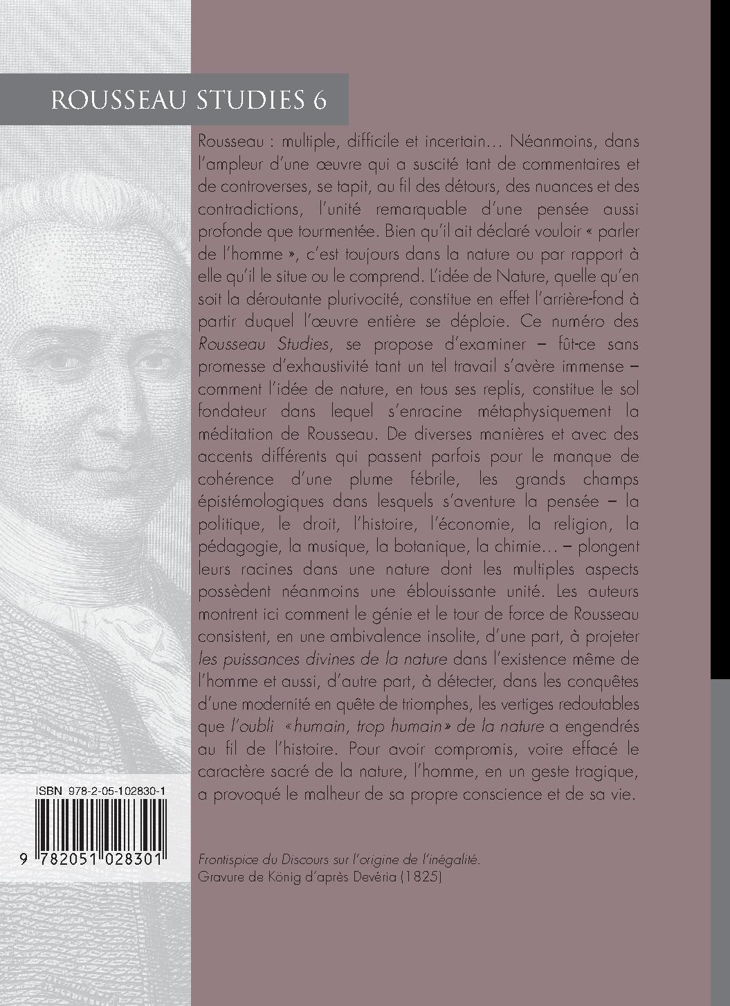 Rousseau : multiple, difficile et incertain… Néanmoins, dans l’ampleur d’une oeuvre qui a suscité tant de commentaires et de controverses, se tapit, au fil des détours, des nuances et des contradictions, l’unité remarquable d’une pensée aussi profonde que tourmentée. Bien qu’il ait déclaré vouloir « parler de l’homme », c’est toujours dans la nature ou par rapport à elle qu’il le situe ou le comprend. L’idée de Nature, quelle qu’en soit la déroutante plurivocité, constitue en effet l’arrière-fond à partir duquel l’oeuvre entière se déploie. Ce numéro des Rousseau Studies, se propose d’examiner – fût-ce sans promesse d’exhaustivité tant un tel travail s’avère immense – comment l’idée de nature, en tous ses replis, constitue le sol fondateur dans lequel s’enracine métaphysiquement la méditation de Rousseau. De diverses manières et avec des accents différents qui passent parfois pour le manque de cohérence d’une plume fébrile, les grands champs épistémologiques dans lesquels s’aventure la pensée – la politique, le droit, l’histoire, l’économie, la religion, la pédagogie, la musique, la botanique, la chimie… – plongent leurs racines dans une nature dont les multiples aspects possèdent néanmoins une éblouissante unité. Les auteurs montrent ici comment le génie et le tour de force de Rousseau consistent, en une ambivalence insolite, d’une part, à projeter les puissances divines de la nature dans l’existence même de l’homme et aussi, d’autre part, à détecter, dans les conquêtes d’une modernité en quête de triomphes, les vertiges redoutables que l’oubli « humain, trop humain » de la nature a engendrés au fil de l’histoire. Pour avoir compromis, voire effacé le caractère sacré de la nature, l’homme, en un geste tragique, a provoqué le malheur de sa propre conscience et de sa vie.