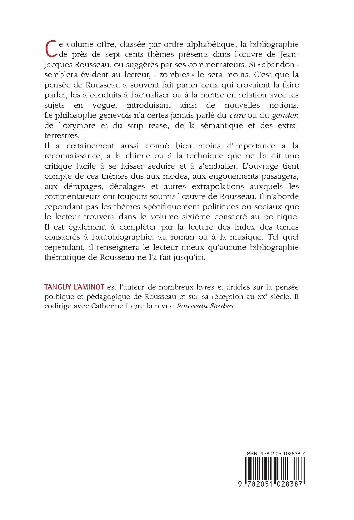 Ce volume offre, classée par ordre alphabétique, la bibliographie de près de sept cents thèmes présents dans l’oeuvre de Jean- Jacques Rousseau, ou suggérés par ses commentateurs. Si « abandon » semblera évident au lecteur, « zombies » le sera moins. C’est que la pensée de Rousseau a souvent fait parler ceux qui croyaient la faire parler, les a conduits à l’actualiser ou à la mettre en relation avec les sujets en vogue, introduisant ainsi de nouvelles notions. Le philosophe genevois n’a certes jamais parlé du care ou du gender, de l’oxymore et du strip tease, de la sémantique et des extraterrestres.