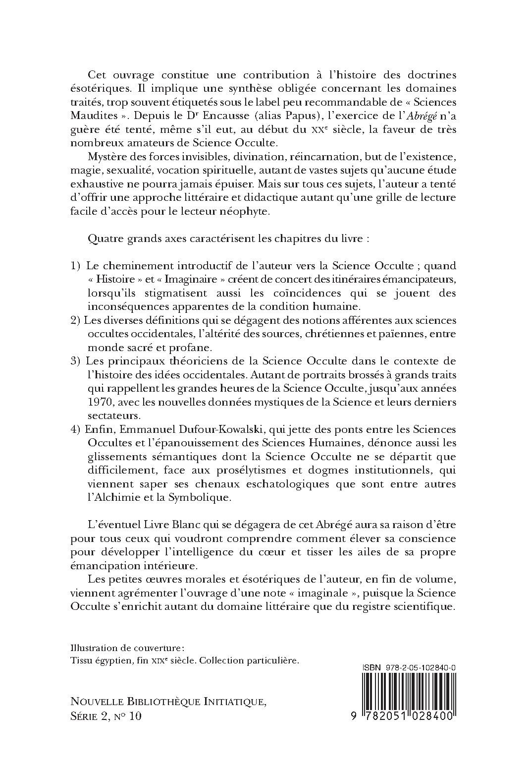 Cet ouvrage constitue une contribution à l’histoire des doctrines ésotériques. Il implique une synthèse obligée concernant les domaines traités, trop souvent étiquetés sous le label peu recommandable de « Sciences Maudites ». Depuis le Dr Encausse (alias Papus), l’exercice de l’Abrégé n’a guère été tenté, même s’il eut, au début du XXe siècle, la faveur de très nombreux amateurs de Science Occulte.